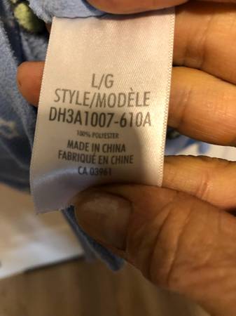 This pajama is a large size and is a baby blue colour. A very comfy PJ for the fall and winter. I paid $65 for it.